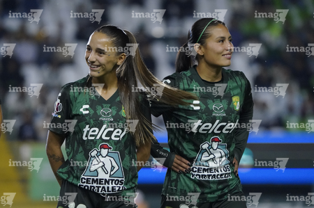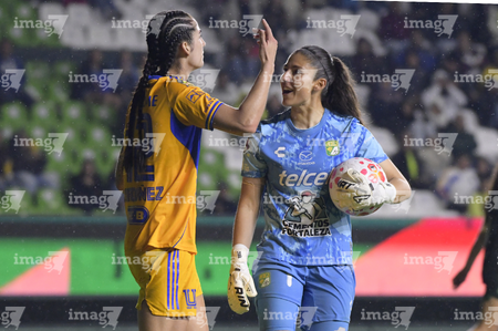 León, Guanajuato, 16 de enero de 2026. Diana Ordoñez y Alondra Camargo, durante el partido correspondiente a la jornada 3 del torneo Clausura 2026 de la Liga BBVA MX Femenil, entre las Esmeraldas del León y las Tigres de la UANL, realizado en el estadio León. Foto: Imago7/ Sebastian Laureano Miranda