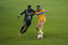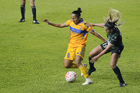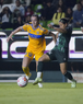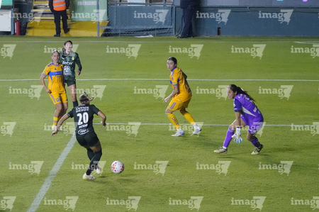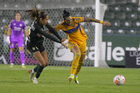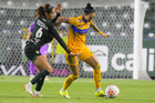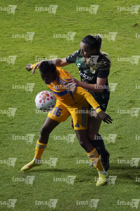 León, Guanajuato, 16 de enero de 2026. Solange Lemos (D), durante el partido correspondiente a la jornada 3 del torneo Clausura 2026 de la Liga BBVA MX Femenil, entre las Esmeraldas del León y las Tigres de la UANL, realizado en el estadio León. Foto: Imago7/ Sebastian Laureano Miranda