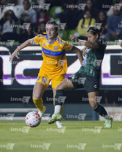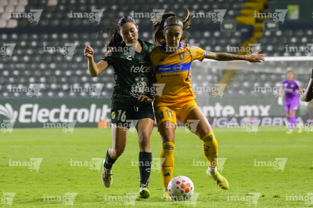 León, Guanajuato, 16 de enero de 2026. Solange Lemos e Ilana Izquierdo, durante el partido correspondiente a la jornada 3 del torneo Clausura 2026 de la Liga BBVA MX Femenil, entre las Esmeraldas del León y las Tigres de la UANL, realizado en el estadio León. Foto: Imago7/ Sebastian Laureano Miranda