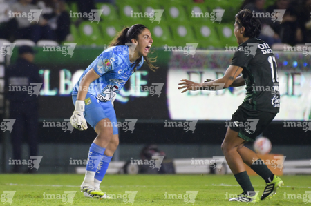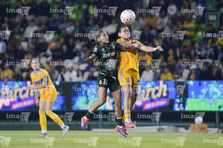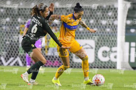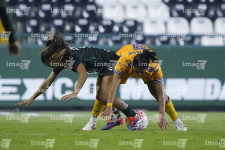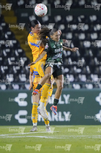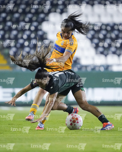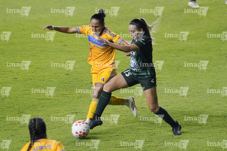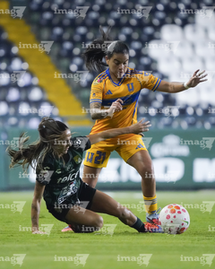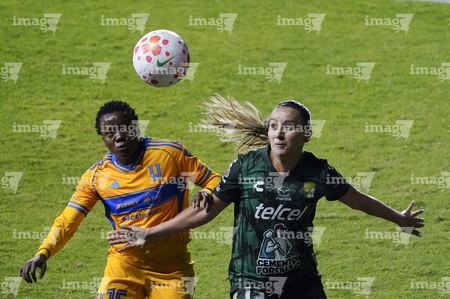 León, Guanajuato, 16 de enero de 2026. Nicole Buenfil y Diana Ordoñez, urante el partido correspondiente a la jornada 3 del torneo Clausura 2026 de la Liga BBVA MX Femenil, entre las Esmeraldas del León y las Tigres de la UANL, realizado en el estadio León. Foto: Imago7/ Sebastian Laureano Miranda
