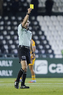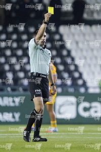 León, Guanajuato, 16 de enero de 2026. Figo Rodolfo López, árbitro central muestra tarjeta amarilla de amonestación, durante el partido correspondiente a la jornada 3 del torneo Clausura 2026 de la Liga BBVA MX Femenil, entre las Esmeraldas del León y las Tigres de la UANL, realizado en el estadio León. Foto: Imago7/ Sebastian Laureano Miranda