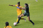 León, Guanajuato, 16 de enero de 2026. Solange Lemos y Selene Cortés, durante el partido correspondiente a la jornada 3 del torneo Clausura 2026 de la Liga BBVA MX Femenil, entre las Esmeraldas del León y las Tigres de la UANL, realizado en el estadio León. Foto: Imago7/ Sebastian Laureano Miranda