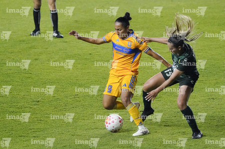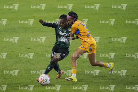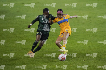 León, Guanajuato, 16 de enero de 2026. Thembi Kgatlana y Rubí Soto, durante el partido correspondiente a la jornada 3 del torneo Clausura 2026 de la Liga BBVA MX Femenil, entre las Esmeraldas del León y las Tigres de la UANL, realizado en el estadio León. Foto: Imago7/ Sebastian Laureano Miranda