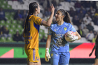 León, Guanajuato, 16 de enero de 2026. Stephany Mayor y Rubí Soto, durante el partido correspondiente a la jornada 3 del torneo Clausura 2026 de la Liga BBVA MX Femenil, entre las Esmeraldas del León y las Tigres de la UANL, realizado en el estadio León. Foto: Imago7/ Sebastian Laureano Miranda