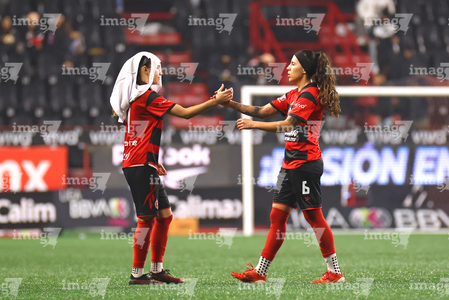 Tijuana, Baja California, 20 de enero de 2026. Karime Abud y Deisy Ojeda, durante el partido correspondiente a la jornada 4 del torneo Clausura 2026 de la Liga BBVA MX Femenil, entre las Xolas de Tijuana y las Bravas de FC Juárez, realizado en el estadio Caliente. Foto: Imago7/ David Vega