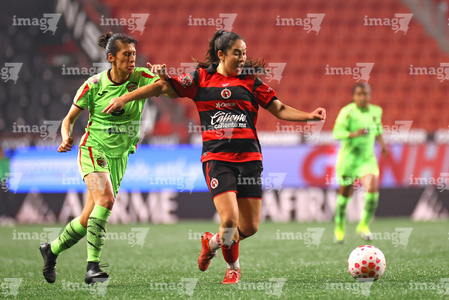 Tijuana, Baja California, 20 de enero de 2026. Amogelang Motau y Karime Abud, durante el partido correspondiente a la jornada 4 del torneo Clausura 2026 de la Liga BBVA MX Femenil, entre las Xolas de Tijuana y las Bravas de FC Juárez, realizado en el estadio Caliente. Foto: Imago7/ David Vega
