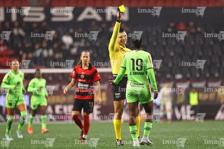 Tijuana, Baja California, 20 de enero de 2026. Alfredo Huerta López, árbitro central muestra tarjeta amarilla de amonestación a Julitha Singano, durante el partido correspondiente a la jornada 4 del torneo Clausura 2026 de la Liga BBVA MX Femenil, entre las Xolas de Tijuana y las Bravas de FC Juárez, realizado en el estadio Caliente. Foto: Imago7/ David Vega