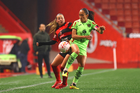 Tijuana, Baja California, 20 de enero de 2026. Aurelie Kaci y Amogelang Motau, durante el partido correspondiente a la jornada 4 del torneo Clausura 2026 de la Liga BBVA MX Femenil, entre las Xolas de Tijuana y las Bravas de FC Juárez, realizado en el estadio Caliente. Foto: Imago7/ Alejandro Gutiérrez Mora