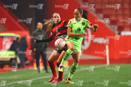 Tijuana, Baja California, 20 de enero de 2026. Dana Sandoval y Liliana Mercado, durante el partido correspondiente a la jornada 4 del torneo Clausura 2026 de la Liga BBVA MX Femenil, entre las Xolas de Tijuana y las Bravas de FC Juárez, realizado en el estadio Caliente. Foto: Imago7/ David Vega