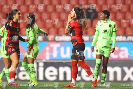 Tijuana, Baja California, 20 de enero de 2026. Deisy Ojeda en reclamo, durante el partido correspondiente a la jornada 4 del torneo Clausura 2026 de la Liga BBVA MX Femenil, entre las Xolas de Tijuana y las Bravas de FC Juárez, realizado en el estadio Caliente. Foto: Imago7/ Alejandro Gutiérrez Mora