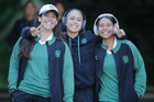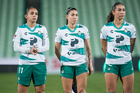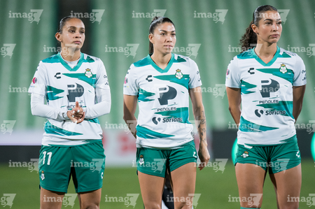 Torreón, Coahuila, 21 de enero de 2026. María Peraza, Kathya Mendoza y Doménica Rodríguez, durante el partido correspondiente a la jornada 4 del torneo Clausura 2026 de la Liga BBVA MX Femenil, entre las Guerreras de Santos Laguna y las Esmeraldas del León, realizado en el estadio Corona. Foto: Imago7/ Saul Perales