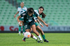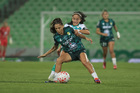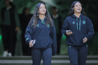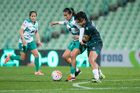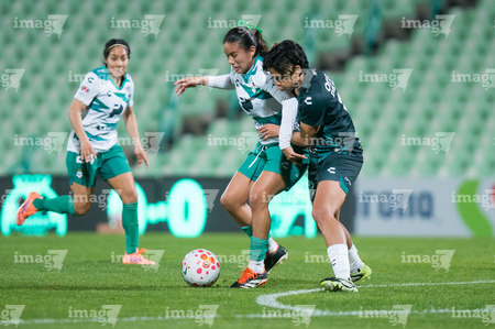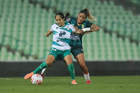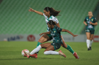 Torreón, Coahuila, 21 de enero de 2026. Solange Lemos y Doménica Rodríguez, durante el partido correspondiente a la jornada 4 del torneo Clausura 2026 de la Liga BBVA MX Femenil, entre las Guerreras de Santos Laguna y las Esmeraldas del León, realizado en el estadio Corona. Foto: Imago7/ Saul Perales