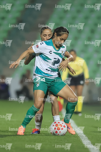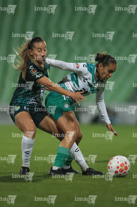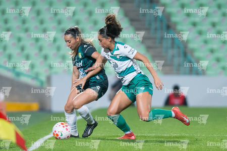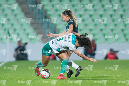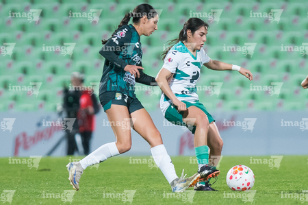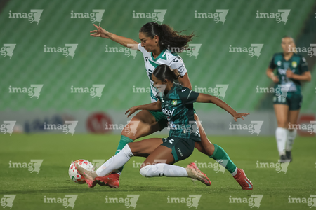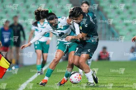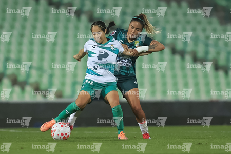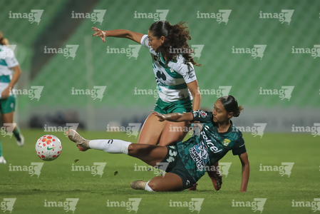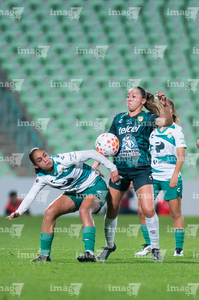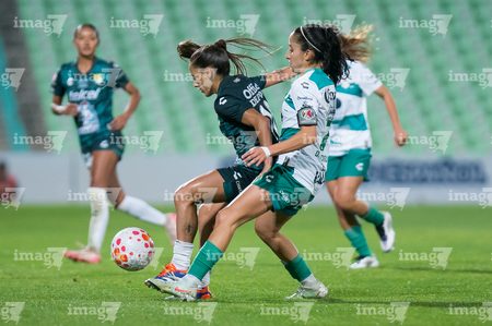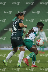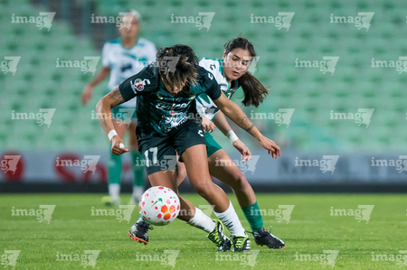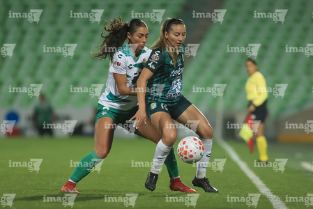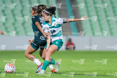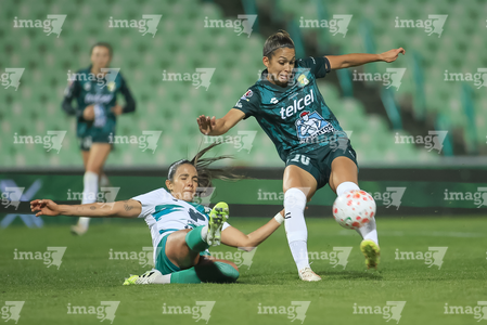 Torreón, Coahuila, 21 de enero de 2026. Sasha Pickard y Vianney Alemán, durante el partido correspondiente a la jornada 4 del torneo Clausura 2026 de la Liga BBVA MX Femenil, entre las Guerreras de Santos Laguna y las Esmeraldas del León, realizado en el estadio Corona. Foto: Imago7/ Saul Perales