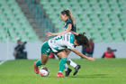 Torreón, Coahuila, 21 de enero de 2026. Sasha Pickard y Rubí Soto, durante el partido correspondiente a la jornada 4 del torneo Clausura 2026 de la Liga BBVA MX Femenil, entre las Guerreras de Santos Laguna y las Esmeraldas del León, realizado en el estadio Corona. Foto: Imago7/ Erick Saavedra