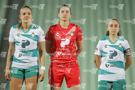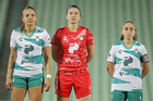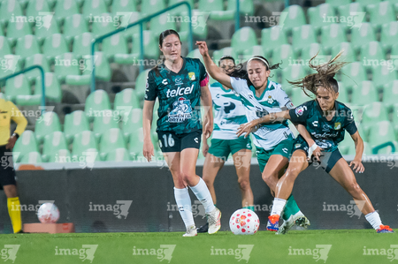 Torreón, Coahuila, 21 de enero de 2026. Mayra Santana, Lia Romero y Sasha Pickard, durante el partido correspondiente a la jornada 4 del torneo Clausura 2026 de la Liga BBVA MX Femenil, entre las Guerreras de Santos Laguna y las Esmeraldas del León, realizado en el estadio Corona. Foto: Imago7/ Erick Saavedra