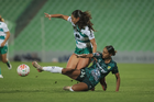 Torreón, Coahuila, 21 de enero de 2026. Doménica Rodríguez y Solange Lemos, durante el partido correspondiente a la jornada 4 del torneo Clausura 2026 de la Liga BBVA MX Femenil, entre las Guerreras de Santos Laguna y las Esmeraldas del León, realizado en el estadio Corona. Foto: Imago7/ Erick Saavedra