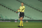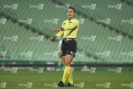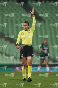 Torreón, Coahuila, 21 de enero de 2026. Itzel Hernández Fuentes, árbitra central, durante el partido correspondiente a la jornada 4 del torneo Clausura 2026 de la Liga BBVA MX Femenil, entre las Guerreras de Santos Laguna y las Esmeraldas del León, realizado en el estadio Corona. Foto: Imago7/ Saul Perales