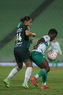 Torreón, Coahuila, 21 de enero de 2026. Solange Lemos y Dania Padilla, durante el partido correspondiente a la jornada 4 del torneo Clausura 2026 de la Liga BBVA MX Femenil, entre las Guerreras de Santos Laguna y las Esmeraldas del León, realizado en el estadio Corona. Foto: Imago7/ Saul Perales