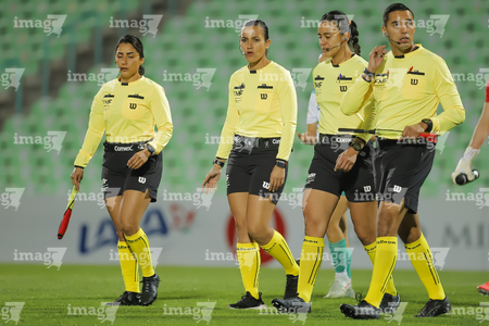 Torreón, Coahuila, 21 de enero de 2026. Árbitros, durante el partido correspondiente a la jornada 4 del torneo Clausura 2026 de la Liga BBVA MX Femenil, entre las Guerreras de Santos Laguna y las Esmeraldas del León, realizado en el estadio Corona. Foto: Imago7/ Saul Perales