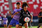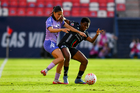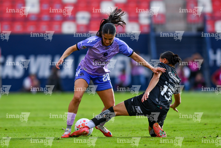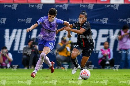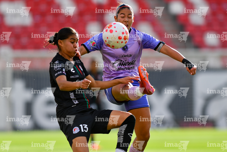 San Luis Potosí, San Luis Potosí, 24 de enero de 2026. Aurora Suárez y Dana Sandoval, durante el partido correspondiente a la jornada 5 del torneo Clausura 2026 de la Liga BBVA MX Femenil, entre el Atlético San Luis y las Xolas de Tijuana, realizado en el estadio Alfonso Lastras. Foto: Imago7/ Olimpia Puga