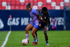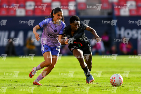 San Luis Potosí, San Luis Potosí, 24 de enero de 2026. Daniela Carrandi y Amina Bello, durante el partido correspondiente a la jornada 5 del torneo Clausura 2026 de la Liga BBVA MX Femenil, entre el Atlético San Luis y las Xolas de Tijuana, realizado en el estadio Alfonso Lastras. Foto: Imago7/ Olimpia Puga