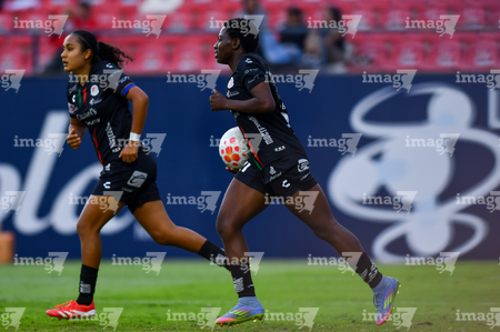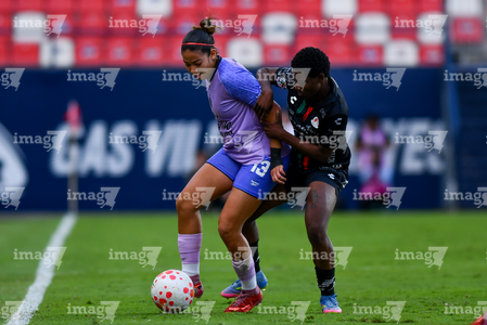 San Luis Potosí, San Luis Potosí, 24 de enero de 2026. Dana Sandoval y Amina Bello, durante el partido correspondiente a la jornada 5 del torneo Clausura 2026 de la Liga BBVA MX Femenil, entre el Atlético San Luis y las Xolas de Tijuana, realizado en el estadio Alfonso Lastras. Foto: Imago7/ Olimpia Puga
