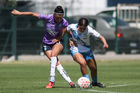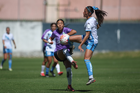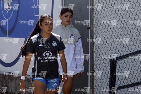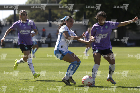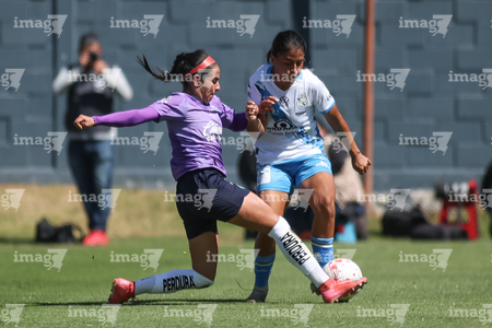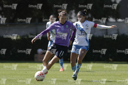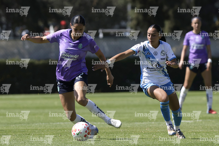 Puebla, Puebla, 25 de enero de 2026. Samantha López y Yulexi Diaz, durante el partido correspondiente a la jornada 5 del torneo Clausura 2026 de la Liga BBVA MX Femenil, entre el Club Puebla y las Chivas Rayadas del Guadalajara, realizado en el Club Alpha 3. Foto: Imago7/ Diego Alducin