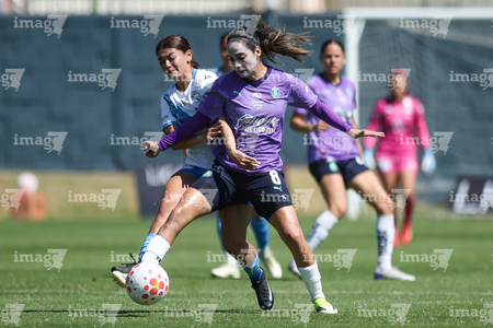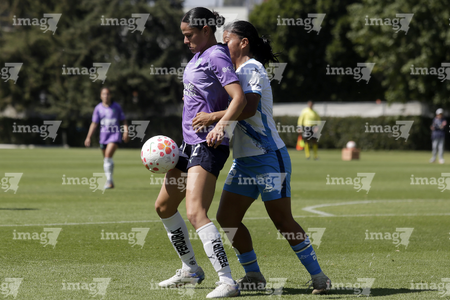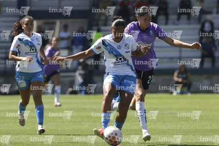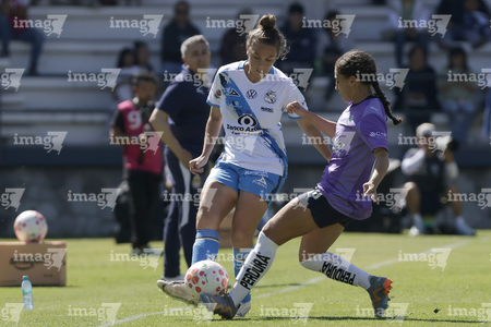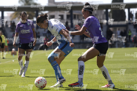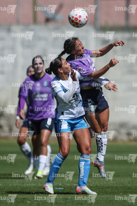 Puebla, Puebla, 25 de enero de 2026. Jasmine Casarez y Yulexi Diaz, durante el partido correspondiente a la jornada 5 del torneo Clausura 2026 de la Liga BBVA MX Femenil, entre el Club Puebla y las Chivas Rayadas del Guadalajara, realizado en el Club Alpha 3. Foto: Imago7/ Mireya Novo