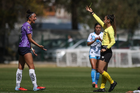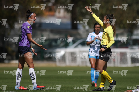 Puebla, Puebla, 25 de enero de 2026. María Fernanda Márquez, árbitra central muestra tarjeta amarilla de amonestación a Samantha López, durante el partido correspondiente a la jornada 5 del torneo Clausura 2026 de la Liga BBVA MX Femenil, entre el Club Puebla y las Chivas Rayadas del Guadalajara, realizado en el Club Alpha 3. Foto: Imago7/ Diego Alducin