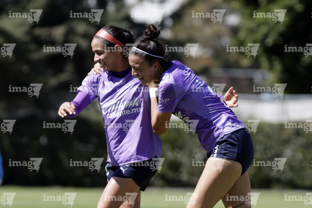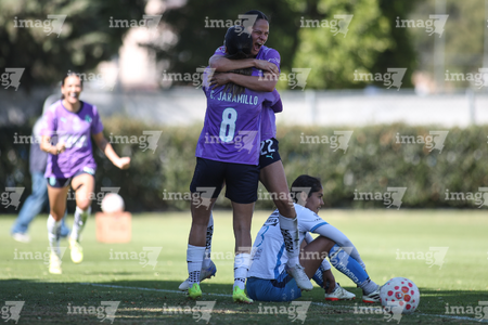 Puebla, Puebla, 25 de enero de 2026. Samantha López y Alicia Cervantes en festejo de gol, durante el partido correspondiente a la jornada 5 del torneo Clausura 2026 de la Liga BBVA MX Femenil, entre el Club Puebla y las Chivas Rayadas del Guadalajara, realizado en el Club Alpha 3. Foto: Imago7/ Diego Alducin