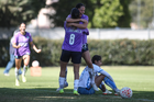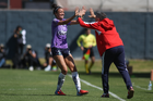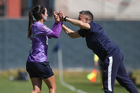 Puebla, Puebla, 25 de enero de 2026. Samantha López y Antonio Contreras, director técnico en festejo de gol, durante el partido correspondiente a la jornada 5 del torneo Clausura 2026 de la Liga BBVA MX Femenil, entre el Club Puebla y las Chivas Rayadas del Guadalajara, realizado en el Club Alpha 3. Foto: Imago7/ Diego Alducin