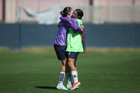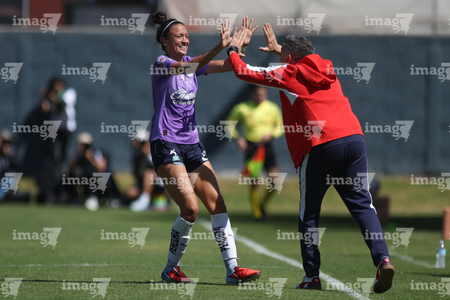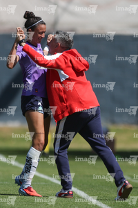 Puebla, Puebla, 25 de enero de 2026. Carolina Jaramillo y Antonio Contreras, director técnico en festejo de gol, durante el partido correspondiente a la jornada 5 del torneo Clausura 2026 de la Liga BBVA MX Femenil, entre el Club Puebla y las Chivas Rayadas del Guadalajara, realizado en el Club Alpha 3. Foto: Imago7/ Diego Alducin