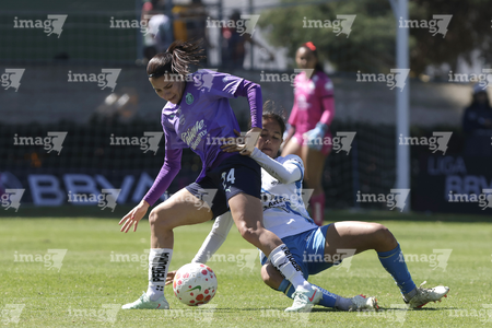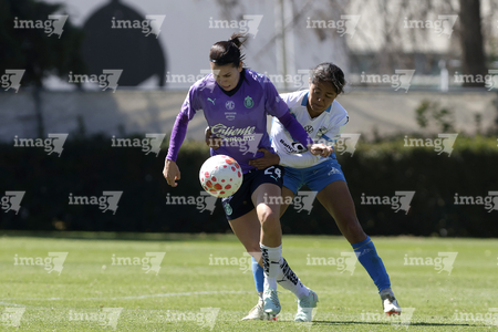 Puebla, Puebla, 25 de enero de 2026. Yulexi Diaz y Carolina Jaramillo, durante el partido correspondiente a la jornada 5 del torneo Clausura 2026 de la Liga BBVA MX Femenil, entre el Club Puebla y las Chivas Rayadas del Guadalajara, realizado en el Club Alpha 3. Foto: Imago7/ Diego Alducin