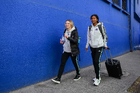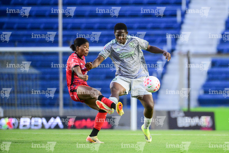 Ciudad de México, 25 de enero de 2026. Taiwo Lawal y Chidinma Okeke, durante el partido correspondiente a la jornada 5 del torneo Clausura 2026 de la Liga BBVA MX Femenil, entre las Águilas del América y las Cañoneras del Mazatlán FC, realizado en el estadio Ciudad de los Deportes. Foto: Imago7/ Alexis Chavez