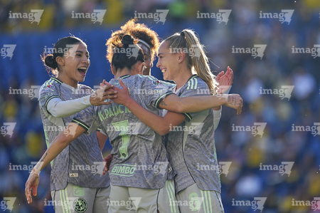 Ciudad de México, 25 de enero de 2026. Kiana Palacios, Kimberly Rodríguez y Karina Rodríguez, durante el partido correspondiente a la jornada 5 del torneo Clausura 2026 de la Liga BBVA MX Femenil, entre las Águilas del América y las Cañoneras del Mazatlán FC, realizado en el estadio Ciudad de los Deportes. Foto: Imago7/ Alexis Chavez