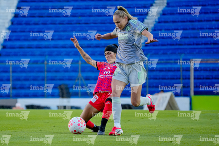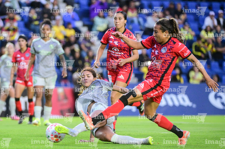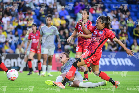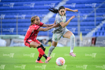 Ciudad de México, 25 de enero de 2026. Lucy Ortiz y María Canseco, durante el partido correspondiente a la jornada 5 del torneo Clausura 2026 de la Liga BBVA MX Femenil, entre las Águilas del América y las Cañoneras del Mazatlán FC, realizado en el estadio Ciudad de los Deportes. Foto: Imago7/ Alexis Chavez