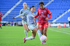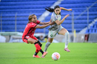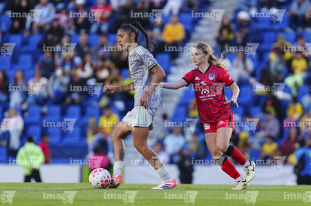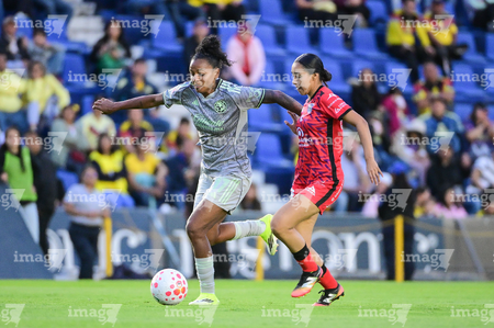Ciudad de México, 25 de enero de 2026. Geyse Ferreira y Paulina Ramos, durante el partido correspondiente a la jornada 5 del torneo Clausura 2026 de la Liga BBVA MX Femenil, entre las Águilas del América y las Cañoneras del Mazatlán FC, realizado en el estadio Ciudad de los Deportes. Foto: Imago7/ Alexis Chavez