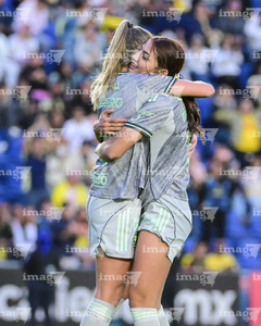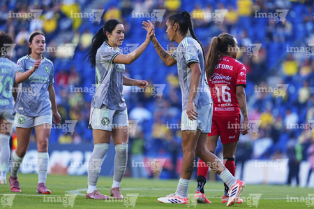 Ciudad de México, 25 de enero de 2026. Irene Guerrero y Montserrat Saldivar en festejo de gol, durante el partido correspondiente a la jornada 5 del torneo Clausura 2026 de la Liga BBVA MX Femenil, entre las Águilas del América y las Cañoneras del Mazatlán FC, realizado en el estadio Ciudad de los Deportes. Foto: Imago7/ Alexis Chavez