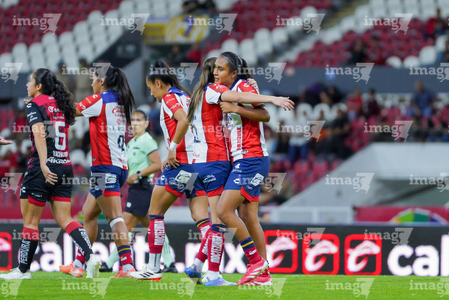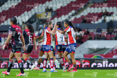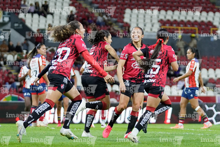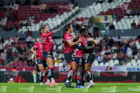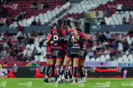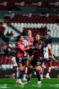 Guadalajara, Jalisco, 30 de enero de 2026. Jugadoras del Atlas femenil en festejo, durante el partido correspondiente a la jornada 6 del torneo Clausura 2026 de la Liga BBVA MX Femenil, entre las Rojinegras del Atlas y el Atlético San Luis, realizado en el estadio Jalisco. Foto: Imago7/ Alejanro Lias
