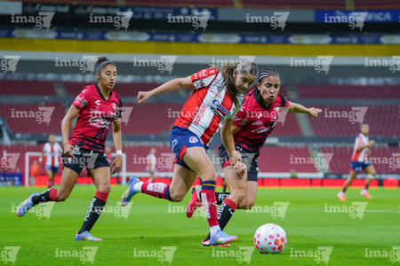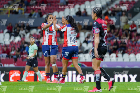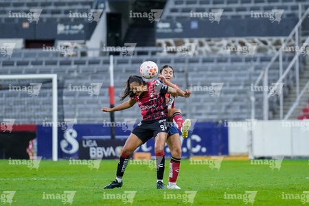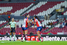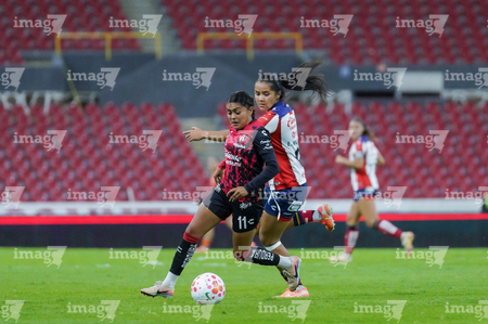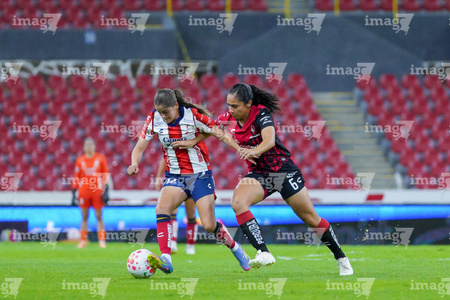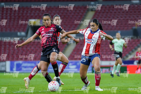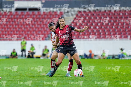 Guadalajara, Jalisco, 30 de enero de 2026. Daniela Meza y Mia Flores, durante el partido correspondiente a la jornada 6 del torneo Clausura 2026 de la Liga BBVA MX Femenil, entre las Rojinegras del Atlas y el Atlético San Luis, realizado en el estadio Jalisco. Foto: Imago7/ Alejandro Lias