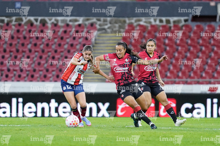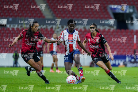 Guadalajara, Jalisco, 30 de enero de 2026. Sanjuana Muñoz, Amina Bello y Maritza Maldonado, durante el partido correspondiente a la jornada 6 del torneo Clausura 2026 de la Liga BBVA MX Femenil, entre las Rojinegras del Atlas y el Atlético San Luis, realizado en el estadio Jalisco. Foto: Imago7/ Hugo Ramirez