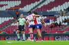 Guadalajara, Jalisco, 30 de enero de 2026. Alexa Herrera y Dirce Delgado, durante el partido correspondiente a la jornada 6 del torneo Clausura 2026 de la Liga BBVA MX Femenil, entre las Rojinegras del Atlas y el Atlético San Luis, realizado en el estadio Jalisco. Foto: Imago7/ Hugo Ramirez