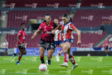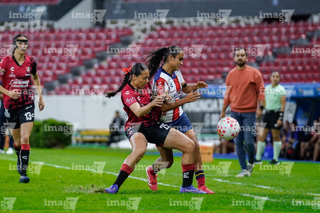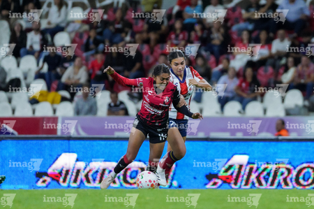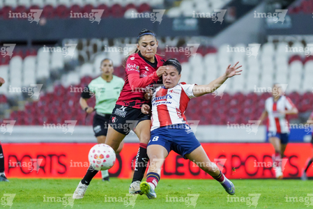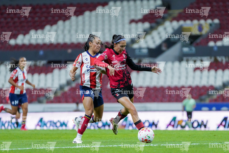 Guadalajara, Jalisco, 30 de enero de 2026. Nithzaye Aguilar y Laila Saravia, durante el partido correspondiente a la jornada 6 del torneo Clausura 2026 de la Liga BBVA MX Femenil, entre las Rojinegras del Atlas y el Atlético San Luis, realizado en el estadio Jalisco. Foto: Imago7/ Alejanro Lias