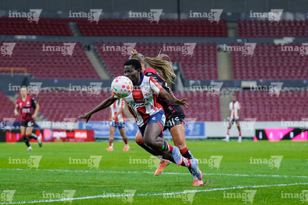 Guadalajara, Jalisco, 30 de enero de 2026. Maritza Maldonado y Amina Bello, durante el partido correspondiente a la jornada 6 del torneo Clausura 2026 de la Liga BBVA MX Femenil, entre las Rojinegras del Atlas y el Atlético San Luis, realizado en el estadio Jalisco. Foto: Imago7/ Alejandro Lias