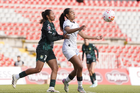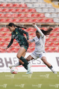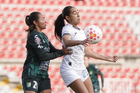 Querétaro, Querétaro, 5 de febrero de 2026. Vanessa González y Yashira Barrientos, durante el partido correspondiente a la jornada 7 del torneo Clausura 2026 de la Liga BBVA MX Femenil, entre el Club Querétaro y las Esmeraldas del León, realizado en el estadio La Corregidora Foto: Imago7/Sebastian Laureano Miranda