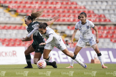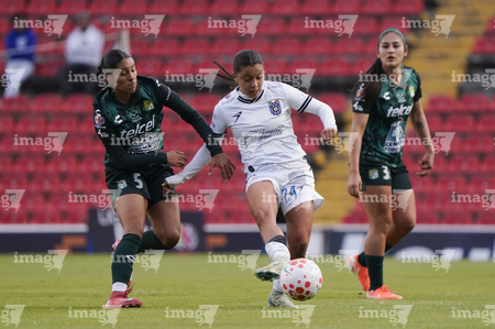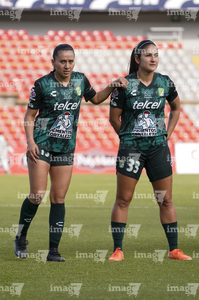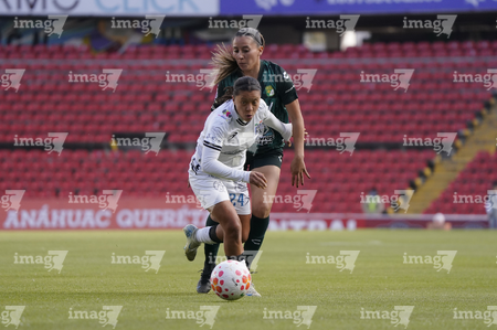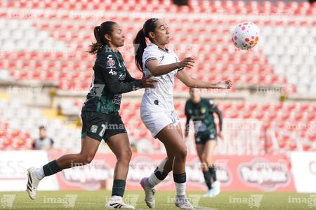 Querétaro, Querétaro, 5 de febrero de 2026. Danya Gutiérrez y Lía Morán, durante el partido correspondiente a la jornada 7 del torneo Clausura 2026 de la Liga BBVA MX Femenil, entre el Club Querétaro y las Esmeraldas del León, realizado en el estadio La Corregidora Foto: Imago7/Sebastian Laureano Miranda