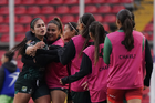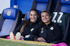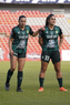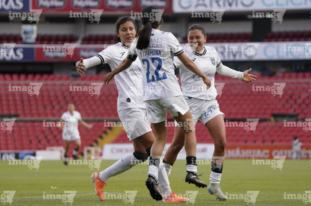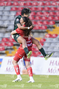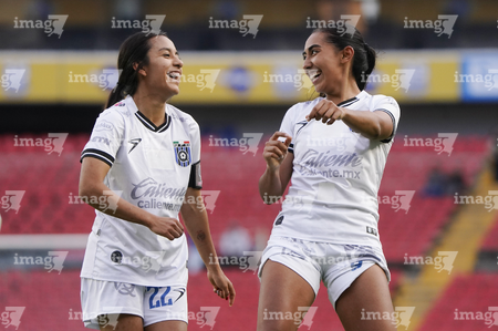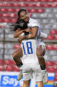 Querétaro, Querétaro, 5 de febrero de 2026. Fernanda Pinilla y Nicole Buenfil en festejo, durante el partido correspondiente a la jornada 7 del torneo Clausura 2026 de la Liga BBVA MX Femenil, entre el Club Querétaro y las Esmeraldas del León, realizado en el estadio Corregidora. Foto: Imago7/ Duilio Muñoz