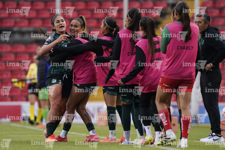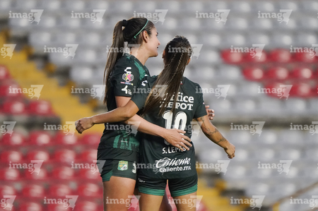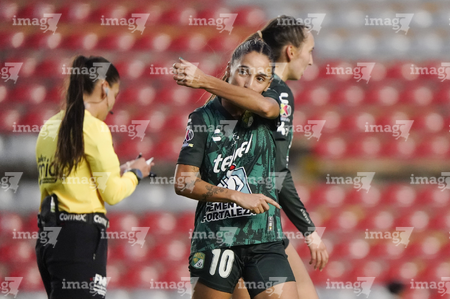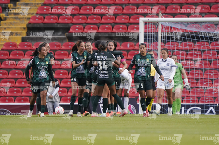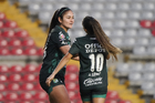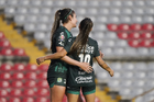 Querétaro, Querétaro, 5 de febrero de 2026. Jugadoras del León en festejo de gol, durante el partido correspondiente a la jornada 7 del torneo Clausura 2026 de la Liga BBVA MX Femenil, entre el Club Querétaro y las Esmeraldas del León, realizado en el estadio La Corregidora Foto: Imago7/Sebastian Laureano Miranda