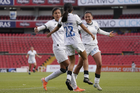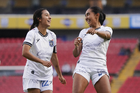 Querétaro, Querétaro, 5 de febrero de 2026. Yashira Barrientos y Solange Lemos en festejo de gol, durante el partido correspondiente a la jornada 7 del torneo Clausura 2026 de la Liga BBVA MX Femenil, entre el Club Querétaro y las Esmeraldas del León, realizado en el estadio La Corregidora Foto: Imago7/Sebastian Laureano Miranda
