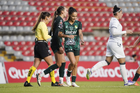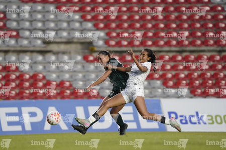 Querétaro, Querétaro, 5 de febrero de 2026. Rubí Soto y Victoria Ceceña, durante el partido correspondiente a la jornada 7 del torneo Clausura 2026 de la Liga BBVA MX Femenil, entre el Club Querétaro y las Esmeraldas del León, realizado en el estadio La Corregidora Foto: Imago7/Sebastian Laureano Miranda